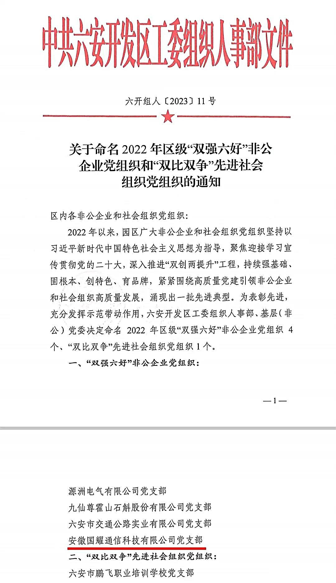 近日,中共六安开发区工委下发了《关于命名2022年区级“双强六好”非公企业党组织和“双比双争”先进社会组织党组织的通知》,其中,安徽国耀通信科技有限公司党支部获评“‘双强六好’非公企业党组织”。