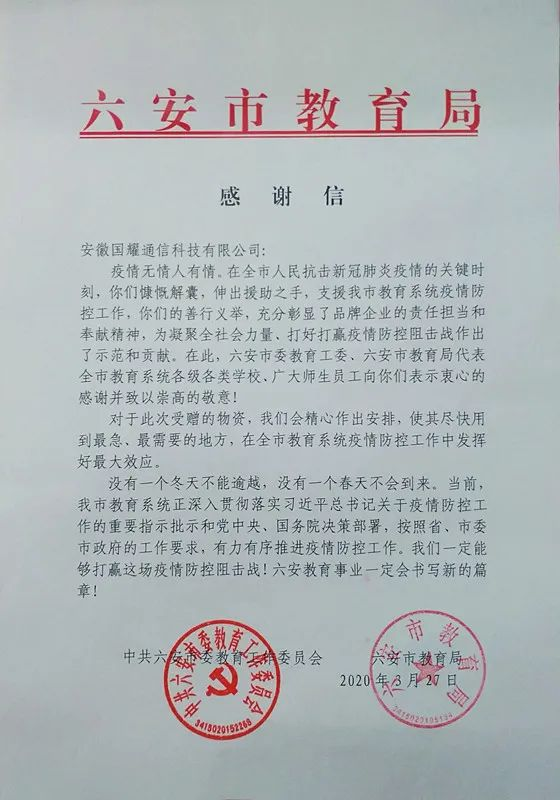 2020年初,新型冠状病毒肺炎疫情汹涌来袭,给人民群众生活带来严重影响。此次疫情也牵动着安徽国耀通信科技有限公司全体人员的心。能为全市教育事业尽一点绵薄之力是每一个有责任感的企业应该做的,相信在社会各界的广泛关注和支持下,我市各级教育部门一定能够打赢这场疫情防控阻击战,守护校园平安,切实保障师生的生命健康安全。